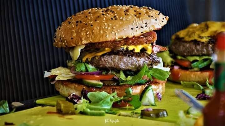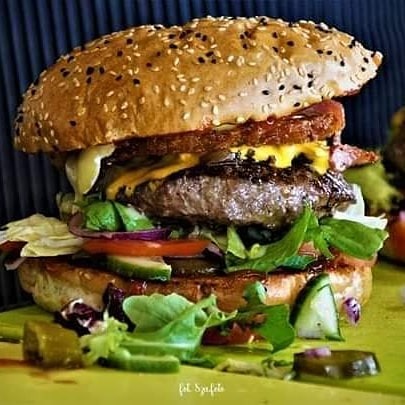 2 x mięso, ser, bułka, sos, mix sałat, dressing, cebula smażona